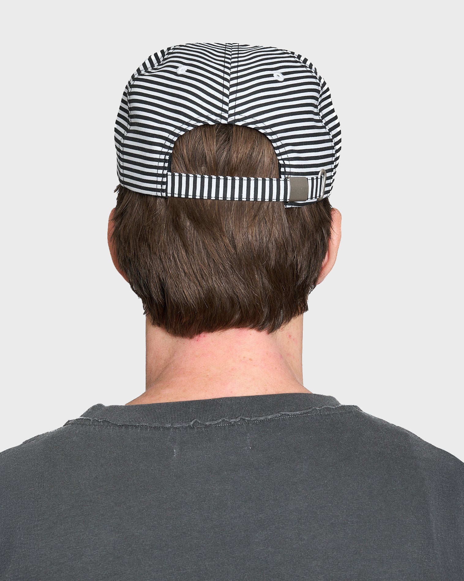 Lau Lau Autumn/Winter 2025 "Baseball cap" is a unstructured striped cap with white embroidery details. The cap is inspired by old school baseball caps.