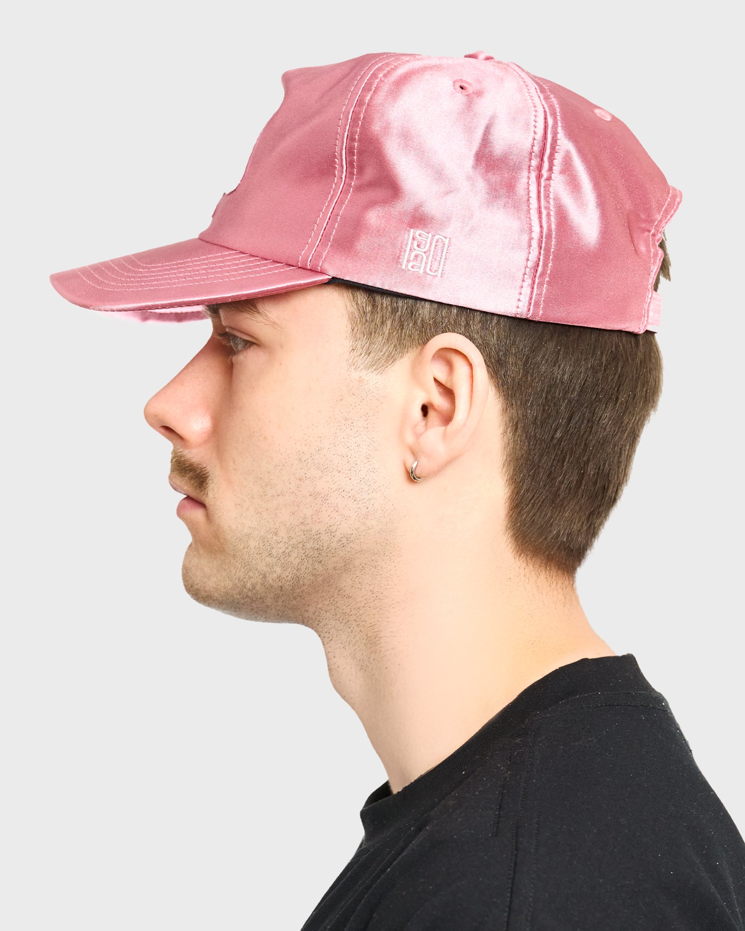 Lau Lau Spring / Summer 2026 "Baseball cap" is a unstructured pink satin cap with white embroidery details. The cap is inspired by old school baseball caps.