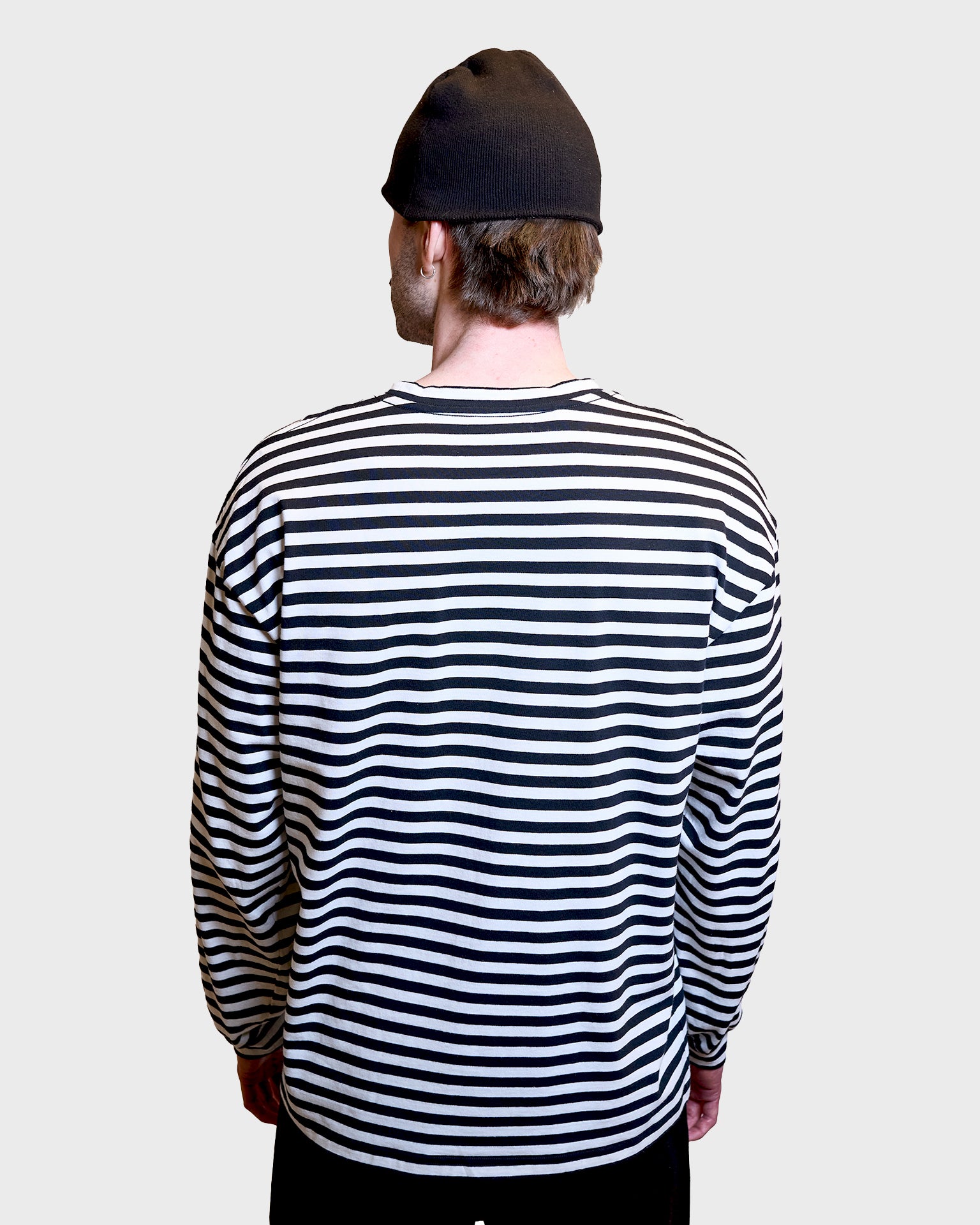 Lau Lau Xmas capsule 2025 "Biggie Long Sleeve" is a black and white striped long sleeve t-shirt with a printed Lau Lau baseball logo on the front.