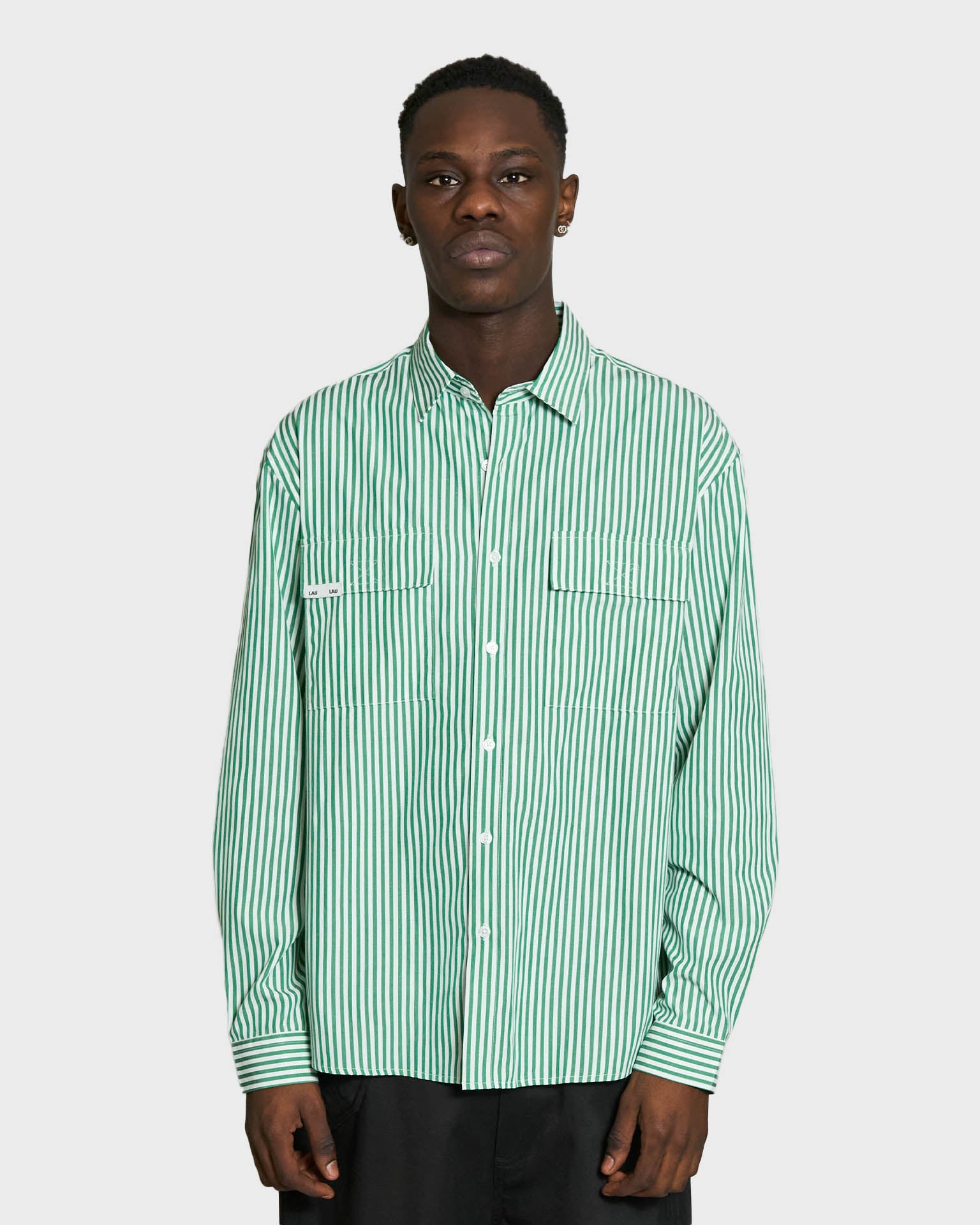 Lau Lau Spring / Summer 2026 "Striped Shirt" is a green and white striped shirt with large front pockets with velcro closure. The shirt has a cropped and box fit.